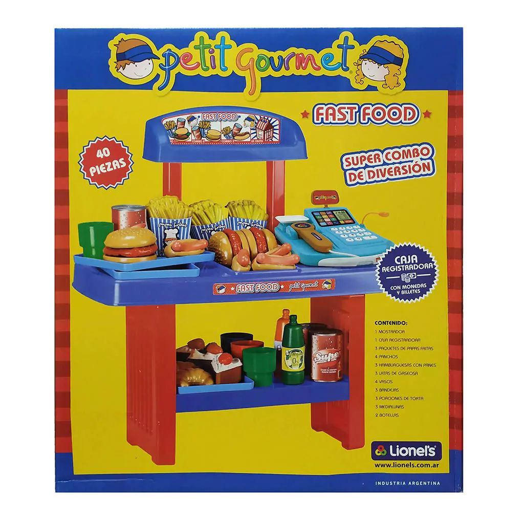 Contiene 1 mostrador, Pizza con 6 porciones, Pizza con 12 elementos para armar y decorar, 6 empanadas, Pala, Cortador, 3 latas grandes, 2 botellas, 3 vasos, 3 platos, 3 tenedores, 3 cuchillos, 1 lata mediana, 1 botella de aceite